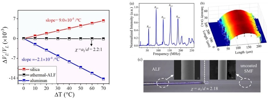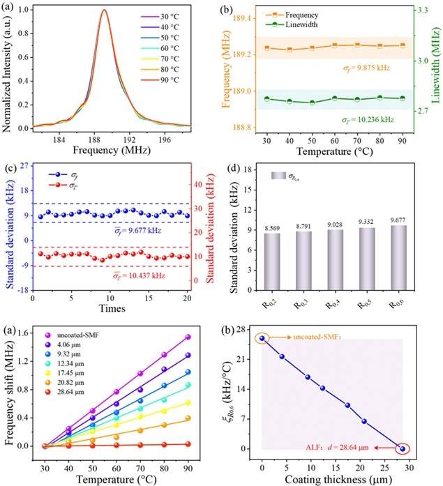 针对这一技术难题,董永康教授课题组提出了绝热前向受激布里渊散射机制,通过理论建模、多物理场仿真以及实验验证的闭环研究,创新性地利用镀铝光纤解决了F-SBS技术长期存在的温度敏感性问题。该研究使用铝涂敷层作为热补偿器,通过精确设计铝涂层厚度与光纤包层半径比例关系,使铝涂层的负温度效应可抵消光纤包层的正温度效应对声波传播的影响,从而使镀铝光纤中横向声波的等效声速-温度系数趋近于零,实现绝热的F-SBS。此外,通过调控铝涂层的空间分布权重,可进一步实现对F-SBS共振频率温度响应的精准调控。课题组提出的绝热前向受激布里渊散射新机制,不仅推动了前向受激布里渊散射在极端环境(如航空航天、深海探测)中的应用,也为多个波导光声器件(如布里渊光纤激光器、声光调制器)的温度补偿设计提供了全新的理论和技术支持。