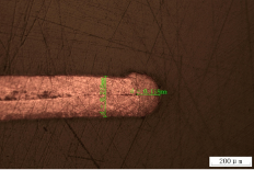 针对微焊点的深度量化检测,每组参数扫描32pcs物料,无论焊点在铜网口还是网线上,深度值均在25微米以内,金相切片未发现深度超数值、铜片击穿现象。
