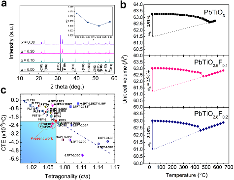 图:PbTiO3-xFx (x = 0,0.1,0.2,0.3)的晶体结构和热膨胀性质。(a)PbTiO3-xFx (x = 0,0.1,0.2,0.3)的XRD衍射图谱,插图为轴比(c/a)随F含量的变化趋势,(b)PbTiO3-xFx (x = 0,0.1,0.2,0.3)的单胞体积随温度的变化,和(c)PbTiO3基铁电材料中热膨胀系数和轴比(c/a)之间的关系。