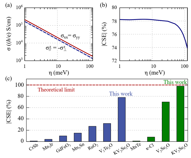 KV2O2Se的结果与已知的其他材料进行了对比分析(图3)。KV2O2Se在电荷中性点的CSE显著高于其他交错磁体,是备受关注的RuO2的两倍,刷新了目前T-odd类 CSE转化效率的记录。KV2O2Se的自旋电导率可同时在横向和纵向上达到3.2×104 (ħ/2e) (S/cm),流密度领先于绝大多数目前已有报道的本征磁性材料。该工作提出了通过“费米面几何工程”实现材料自旋性能调控可达量子极限的原创思路,并建议了有效的候选材料。