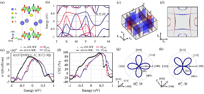 图2 KV2Se2O的电子结构和自旋电导率的理论计算结果