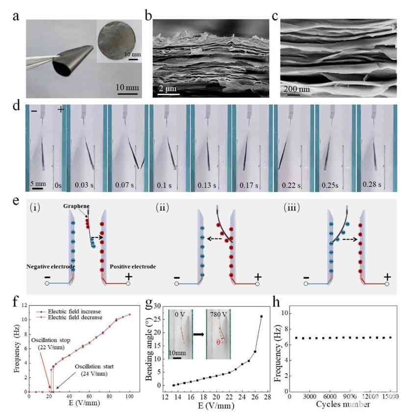 该石墨烯振荡器为悬臂梁结构,放置在两平行板电极之间,一端固定,另一端自由悬挂。在电极之间施加360V的直流电压(电场强度为24 V mm−1),石墨烯薄膜在两电极之间产生了持续的弯曲振荡。其振荡运动的驱动机制归因于静电感应效应,以及荷电极性变化引起的静电力方向变化。振荡运动的频率可通过施加的电压来控制,在100Vmm−1的电场强度下,振荡频率可达10.8 Hz。