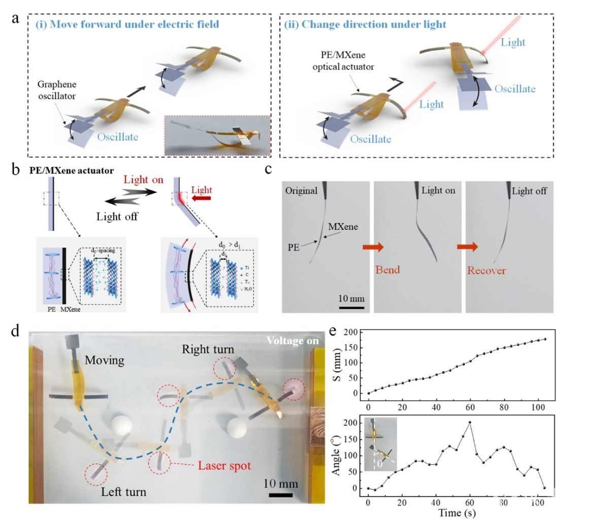 通过电场驱动的机械振荡运动,可以初步实现仿海豹机器人的自主运动。然而,仅靠振荡运动很难控制机器人的运动方向。因此,进一步引入能产生可逆变形的柔性驱动器作为仿生前鳍,来控制运动的方向。为了减少仿生前鳍的加入对机器人整体结构和运动的影响,选择了能远程操控的光驱动器来构建仿生前鳍。当施加直流电压后,石墨烯振荡器产生振荡推动机器人前进。在此过程中,外部光束照射到光驱动器上,使其变形并接触到下极板,导致移动中的机器人转向。作为验证,展示了仿海豹机器人在电压和光照的双重刺激下,以“S”轨迹绕过两个障碍物。