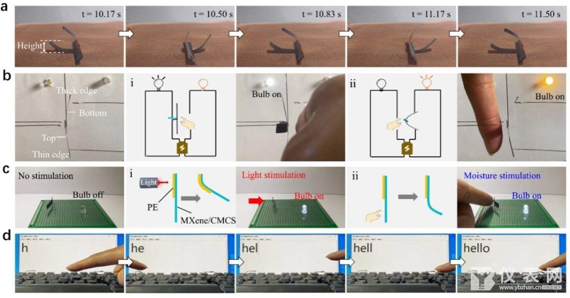 此外,该团队还与哈尔滨工业大学彭庆宇教授合作,开发了一种具有“类二极管式”变形行为的湿度响应MXene柔性薄膜驱动器。基于其厚度梯度结构以及MXene/羧甲基壳聚糖复合物对水分子的高度敏感性,该薄膜驱动器能够在水分梯度刺激下产生“类二极管式”的驱动变形行为,其变形行为与厚度梯度方向以及水分源的方向高度相关。当水分刺激复合膜底部时,薄膜的弯曲轴垂直于厚度梯度方向;当水分刺激复合膜顶部时,薄膜的弯曲轴平行于厚度梯度方向。基于该柔性驱动器独特的湿度响应行为,发展了一系列智能应用,包括水分梯度刺激下的柔性自振荡器件,以及基于人体代谢水分刺激的智能非接触开关、非接触键盘、可穿戴智能热管理服饰、可识别人体呼吸状态的自供电传感器等。相关成果以题为“MXene/Carboxymethyl Chitosan Moisture Responsive Soft Actuator with Diode-Like Actuation for Versatile Applications Driven by Human Metabolism”的论文发表在《Advanced Science》上。