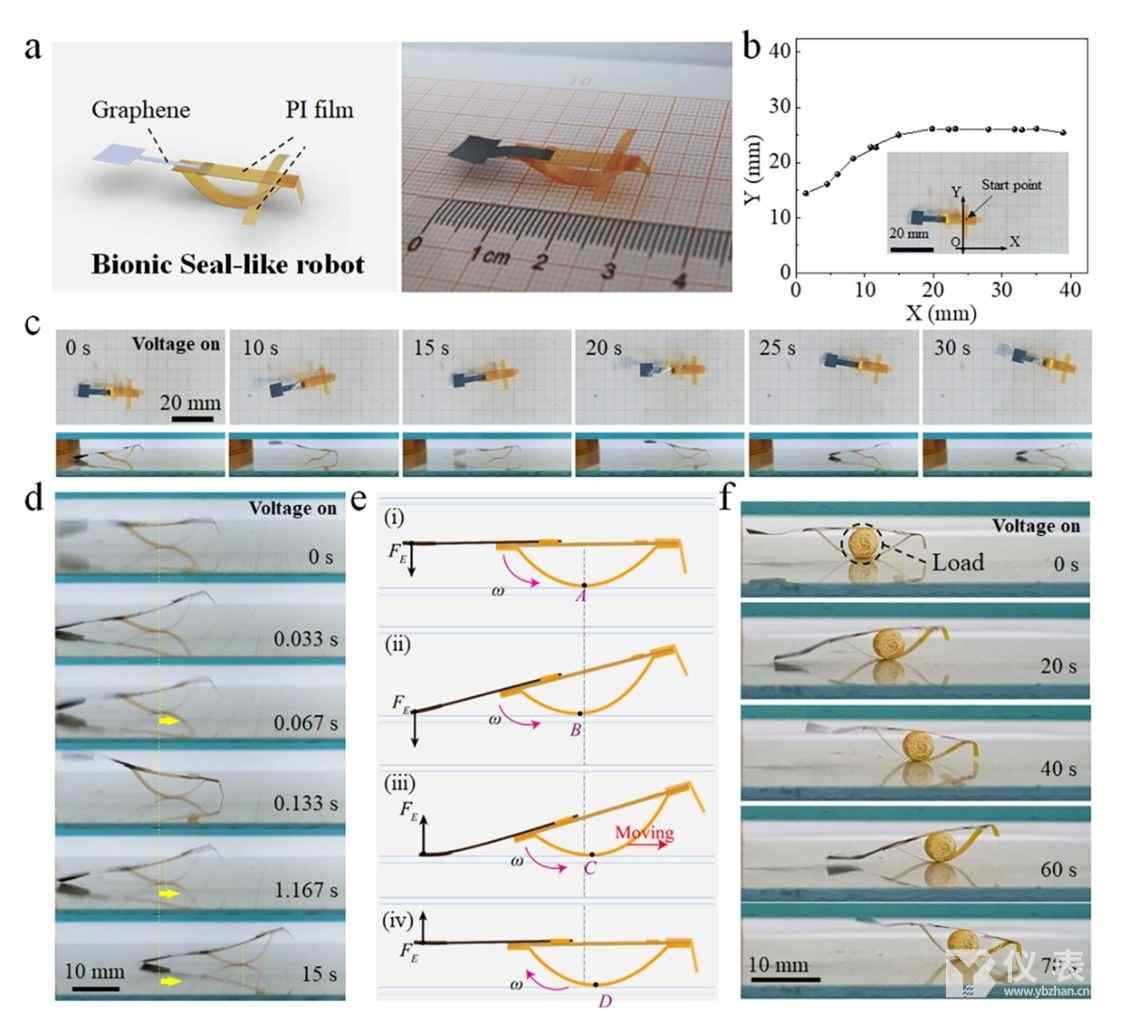 基于石墨烯振荡器在直流电场下的持续振荡运动特性,可用来构建一种新型的电-机械动力系统。通过模仿海豹在水里和地面上的运动,团队设计了一种可以在电场下自主移动的仿海豹柔性机器人。该机器人以石墨烯振荡器作为后鳍,聚酰亚胺(PI)薄膜为身体。石墨烯振荡器产生的振荡运动为机器人运动提供了持续的机械动力,半圆形PI身体为机器人的运动提供了支撑点,并减少了机器人与地面之间的摩擦。与海豹在水下通过摆动后鳍向前移动类似,当施加电场时,仿海豹机器人可以通过石墨烯振荡器的往复振荡在电极板上实现自主运动。在30秒内,机器人运动了约49mm距离。该仿海豹机器人还可以携带一个约为自重5.2倍(44.6mg)的物体向前运动。这表明了该机器人在特殊场景中的潜在应用,如在狭窄的带电环境中运输物体、检测等。