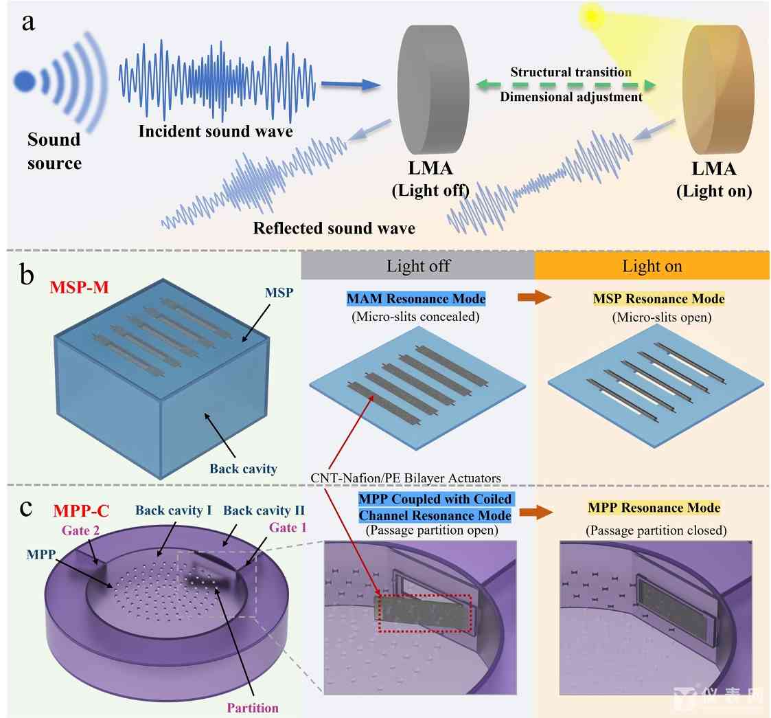 在柔性智能光驱动器的应用方面,该团队针对低频噪声污染的高效声衰减需求,与爱沙尼亚塔尔图大学等多单位合作,首次将光活性聚合物智能材料与声学超材料结合,提出了一种新型可编程光调制吸声体(LMA)的概念,其通过光响应柔性智能驱动材料实现了无束缚、超宽带声学调制。与几何结构固定、可调性有限的传统超材料不同,LMA可在紧凑构型中实现超材料结构转变与尺寸参数调节,从而在低强度光刺激下,实现对吸声特性的可编程控制。相关成果以“A programmable acoustic metamaterial: achieving untethered ultra-broadband modulation with photoactive structural transition”为题发表在《Materials Horizons》上。