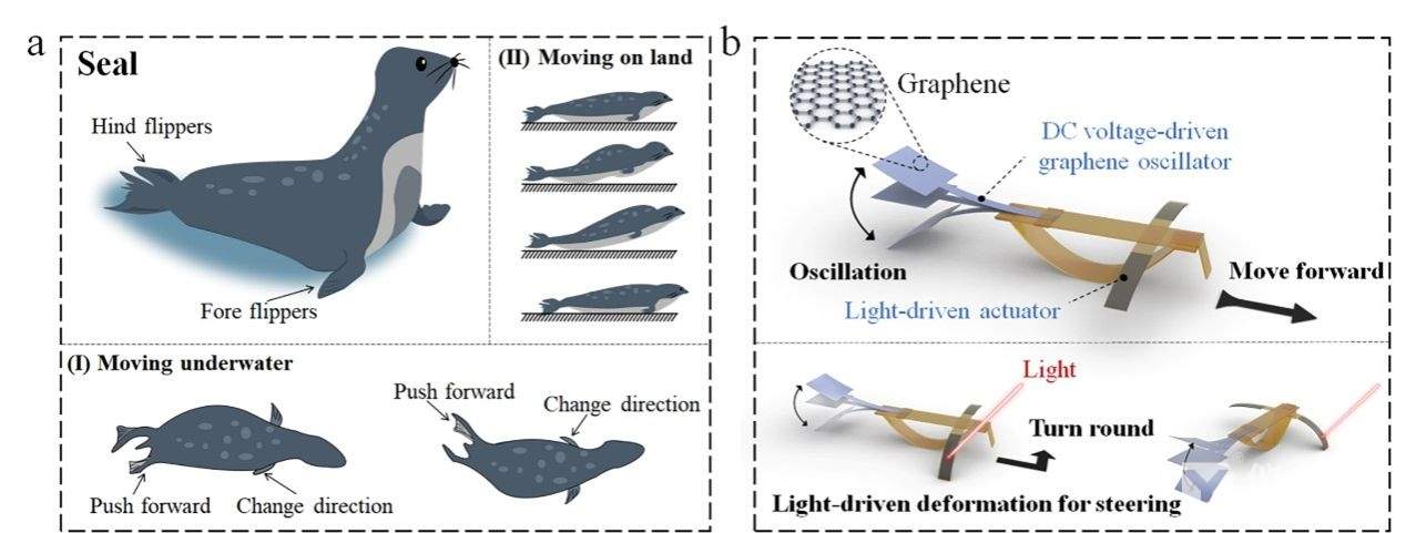 海豹能在水下和地面运动。在水下,海豹主要依靠摆动后鳍来提供向前推力,并通过拍打前鳍来改变运动方向。相比之下,海豹在陆地上则主要通过自身的背腹起伏向前移动。由于缺乏后鳍连续拍打所提供的推力,海豹在地面上的移动速度相对较慢。受海豹两种运动模式的启发,团队设计了一种仿海豹柔性机器人。该机器人包含两个部分:(1)模拟海豹后鳍的石墨烯振荡器,在直流电压驱动下产生连续拍打动作,为运动提供驱动力;(2)两侧安装柔性光驱动器,模拟海豹的前鳍用于调整运动方向。