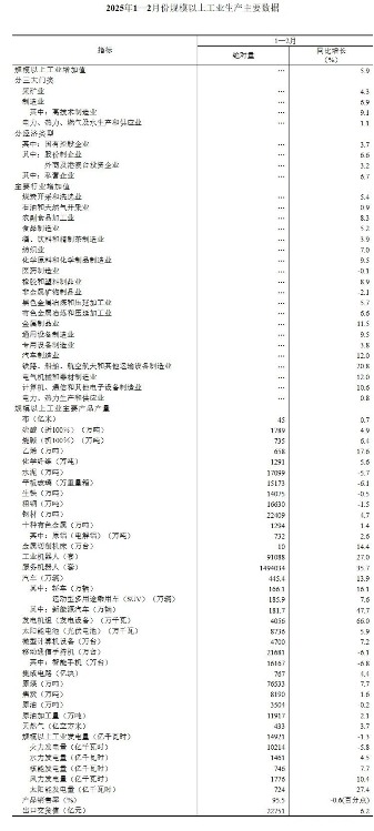 分产品看,1—2月份,规模以上工业623种产品中有378种产品产量同比增长。其中,钢材22409万吨,同比增长4.7%;水泥17099万吨,下降5.7%;十种有色金属1294万吨,增长1.4%;乙烯658万吨,增长17.6%;汽车445.4万辆,增长13.9%,其中新能源汽车181.7万辆,增长47.7%;发电量14921亿千瓦时,下降1.3%;原油加工量11917万吨,增长2.1%。