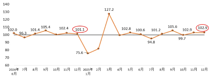 2025年12月,建筑材料工业景气指数为102.9点,高于临界点,处于景气区间,与上月持平,比上年同月高1.8点,建材行业运行保持平稳。