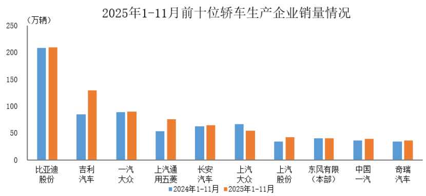 数据简报 | 2025年1-11月前十位轿车生产企业销售情况简析 日期: 2026-03-20 06:40 栏目:市场分析 浏览: 摘要与去年同期相比,上汽大众销量下降,其他企业销量均呈不同程度增长。 【机床商务网栏目 市场分析】据中国汽车工业协会统计分析,2025年1-11月,销量排名前十位的轿车生产企业共销售782.6万辆,占轿车销售总量的69.3%。 在上述十家企业中,与去年同期相比,上汽大众销量下降,其他企业销量均呈不同程度增长。 本文地址: https://www.weifangpifu.com/shichangfenxi/3616.html 上一篇:数据简报 | 2025年1-11月前十位SUV生产企业销售情 下一篇:2025年10月中国各地汽车产量数据统计 相关推荐 【数据发布】2025年11月份规模以上工业增加值增长4.8% 数据 | 2025年11月内燃机行业销量综述 数据 |2025年1-11月内燃机行业进出口 数据简报 | 2025年1-11月前十位MPV生产企业销售情况简析