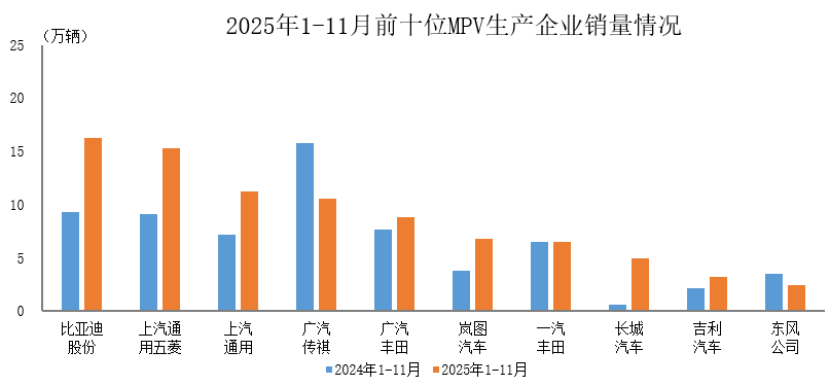 数据简报 | 2025年1-11月前十位MPV生产企业销售情况简析 日期: 2026-03-20 06:40 栏目:市场分析 浏览: 摘要与去年同期相比,广汽传祺和东风公司销量下降,其他企业销量均呈不同程度增长。 据中国汽车工业协会统计分析,1-11月,销量排名前十位的MPV生产企业共销售86.2万辆,占MPV销售总量的78.3%。 在上述十家企业中,与去年同期相比,广汽传祺和东风公司销量下降,其他企业销量均呈不同程度增长。 来源:中汽协会行业信息部 本文地址: https://www.weifangpifu.com/shichangfenxi/3619.html 上一篇:【数据发布】2025年11月份能源生产情况 下一篇:数据 |2025年1-11月内燃机行业进出口 相关推荐 【数据发布】2025年11月份规模以上工业增加值增长4.8% 数据 | 2025年11月内燃机行业销量综述 数据 |2025年1-11月内燃机行业进出口 数据简报 | 2025年1-11月前十位MPV生产企业销售情况简析