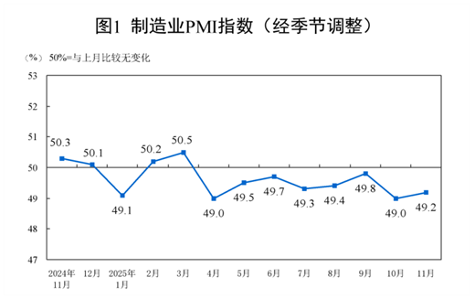 11月份,制造业采购经理指数(PMI)为49.2%,比上月上升0.2个百分点,景气水平有所改善。