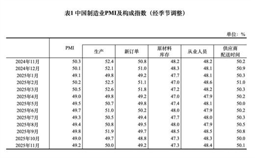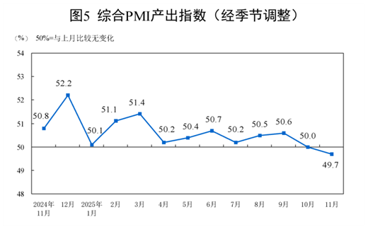 11月份,综合PMI产出指数为49.7%,比上月下降0.3个百分点。