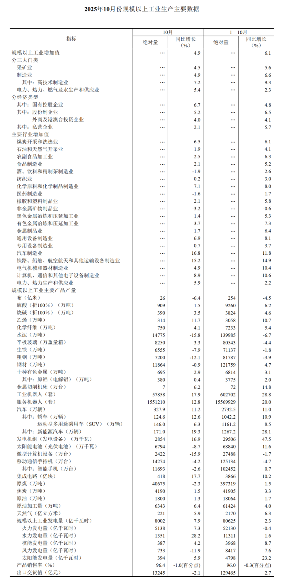 分产品看,10月份,规模以上工业623种产品中有313种产品产量同比增长。其中,钢材11864万吨,同比下降0.9%;水泥14775万吨,下降15.8%;十种有色金属695万吨,增长2.9%;乙烯314万吨,增长11.7%;汽车327.9万辆,增长11.2%,其中新能源汽车171.0万辆,增长19.3%;发电量8002亿千瓦时,增长7.9%;原油加工量6343万吨,增长6.4%。