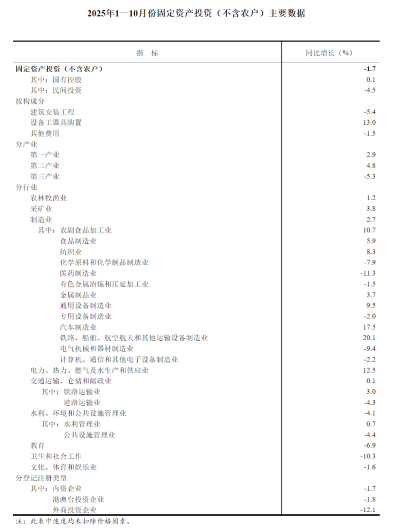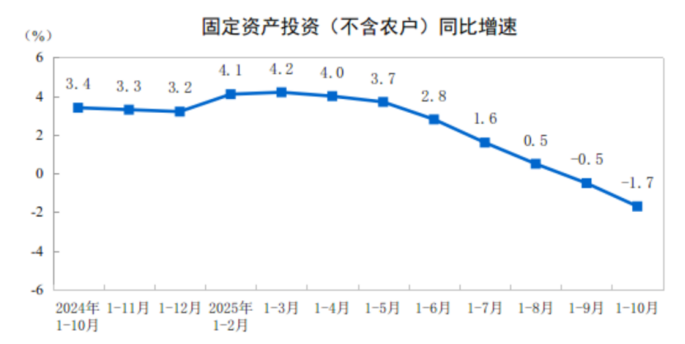 【机床商务网栏目 市场分析】2025年1—10月份,全国固定资产投资(不含农户)408914亿元,同比下降1.7%(按可比口径计算,详见附注7)。其中,民间固定资产投资同比下降4.5%。从环比看,10月份固定资产投资(不含农户)下降1.62%。