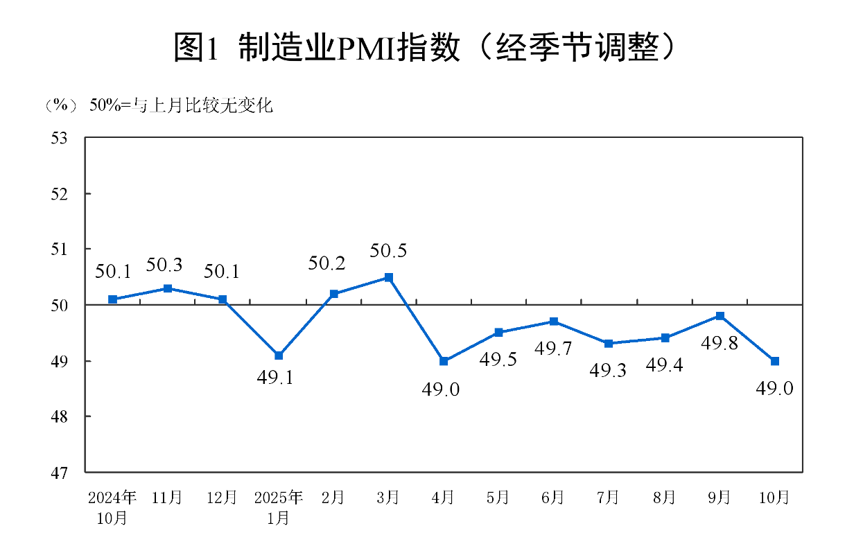 10 月制造业生产活动略有放缓,生产指数和新订单指数分别为 49.7% 和 48.8%,较上月分别下降 2.2 个和 0.9 个百分点,反映市场供需两端同步回落。高技术制造业、装备制造业、消费品行业 PMI 分别为 50.5%、50.2% 和 50.1%,持续处于扩张区间,成为稳增长的关键引擎;生产经营活动预期指数维持在 52.8% 的扩张区间,有色金属冶炼、铁路船舶航空航天设备等行业预期指数超 60.0%,企业对市场前景保持乐观。