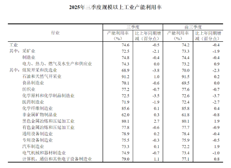 分三大门类看,2025年三季度,采矿业产能利用率为72.5%;制造业产能利用率为74.8%;电力、热力、燃气及水生产和供应业产能利用率为74.3%。