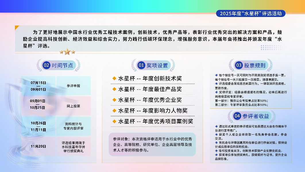 · 奖项设置全面:涵盖年度创新技术奖、年度最佳产品奖、年度优秀企业奖、年度影响力人物奖、年度优秀项目案例奖五大奖项,从技术、产品、企业、人物到项目,全维度覆盖污水处理领域的创新成果。无论是能显著降低污泥含水率的脱水技术,还是实现智能化运营的处理系统,只要经实践检验能为行业降本增效,均可参与,接受由院士、资深工程师及企业技术负责人组成的权威评审团的专业评定。